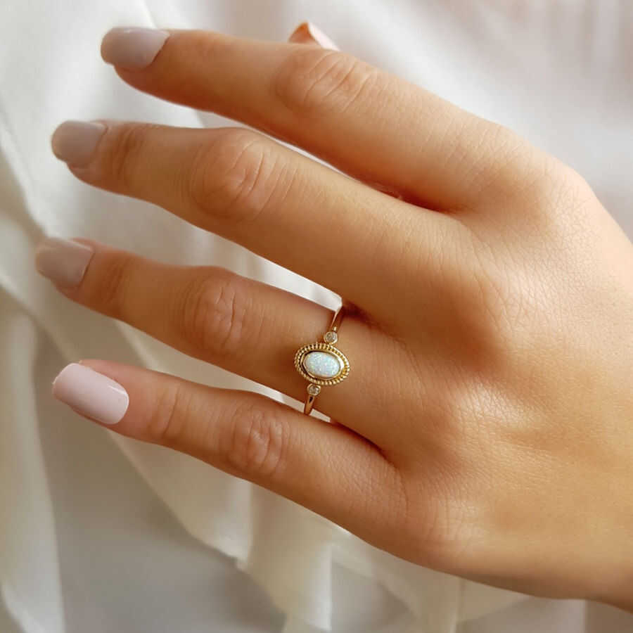 14 Ayar Altın Beyaz Opal Taşlı Yüzük