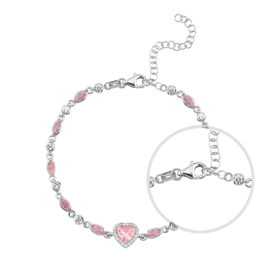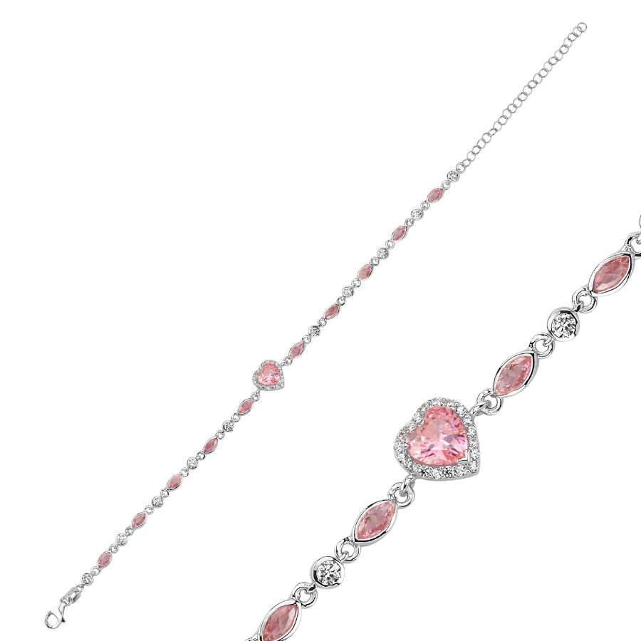 Pembe Taşlı Kalp Zincir Kadın Gümüş Bileklik